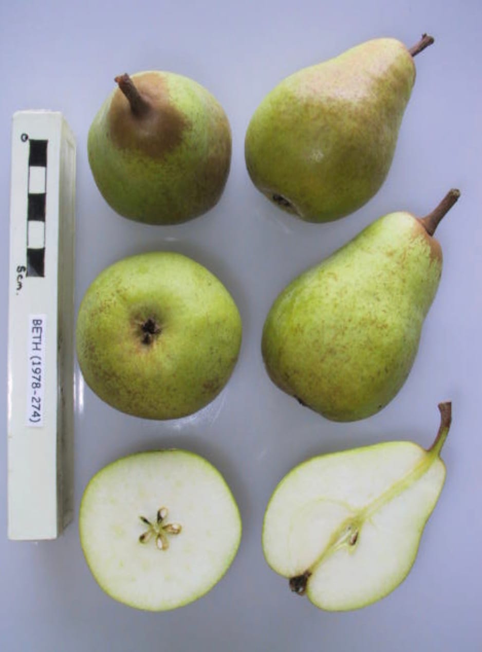 Compact dessert pear, 2.5-8m tall depending upon the rootstock. Flowers white, fruit yellow-green, small and sweet. Pollination group 3. Season of use: September