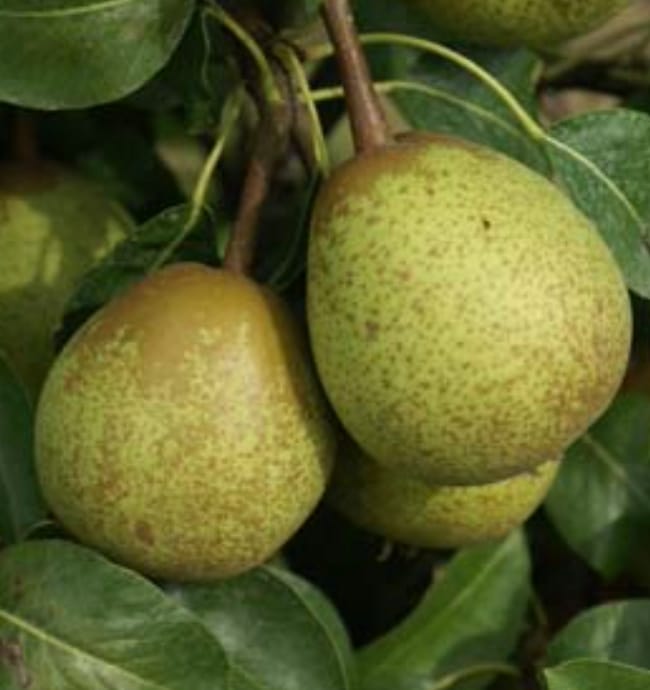 A medium-sized, upright tree with long, shiny, oval leaves and white blossom in spring. The small, round-to-conical, dessert pears have greenish-yellow skin with variable russetting. The pale yellow flesh is juicy, melting and sweet but with little flavour. Pick in early autumn and use to mid-autumn; very hardy and crops reliably even in cooler conditions. Not self-fertile, in pollination group 2